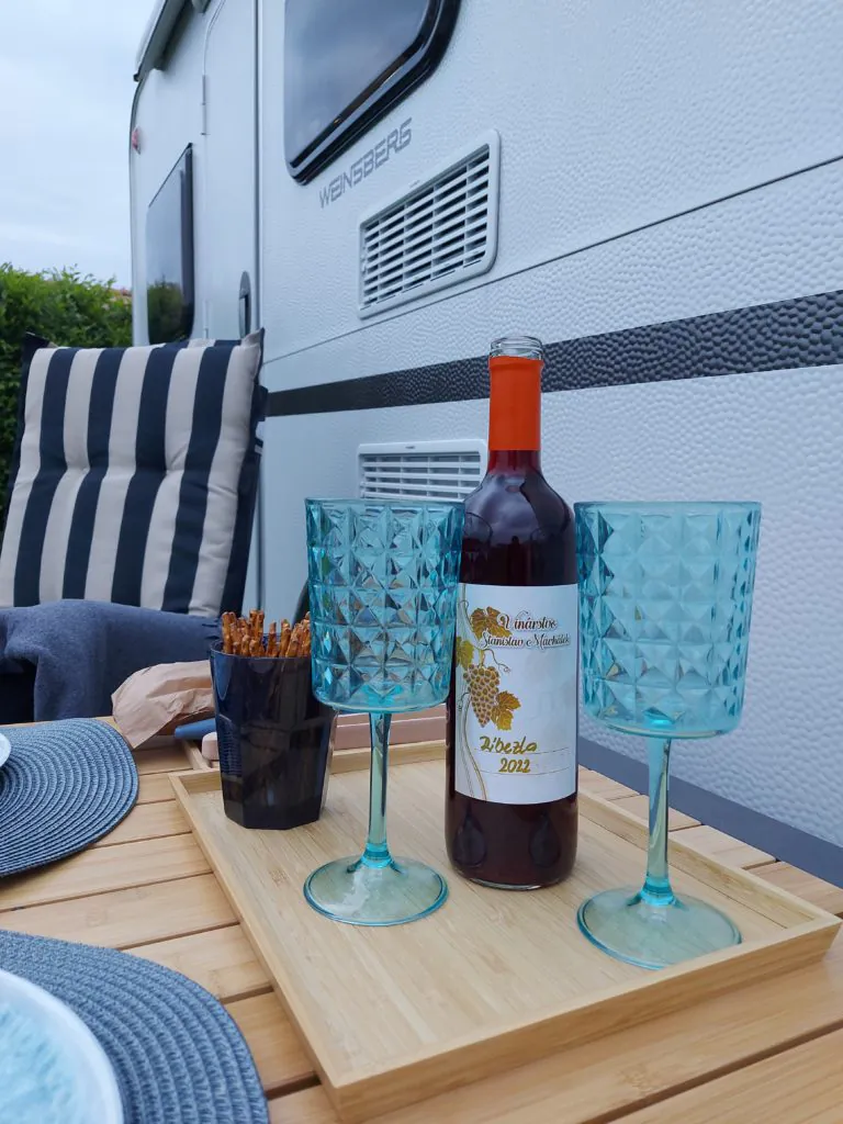 Ak by sa vám zdalo, že sme toho tento deň už zažili dosť, tak nie, nám to ešte nestačilo. Naladení z vínnej akcie sme sa vybrali k nášmu domácemu vinárovi, na ktorého pozemku sme kempovali, na návštevu jeho vínneho sklípku. Ponúkol nám ochutnávku jeho vín a posadil nás medzi ďalších ochutnávačov. Ochutnali sme 14 druhov vín, jazyk sa nám rozviazal, a po 3 hodinách s pár zakúpenými fľašami sme boli radi, že náš domček na kolesách je odparkovaný hneď na kopčeku nad vínnym sklepom. Ďakovali sme, že ho máme tak blízko.